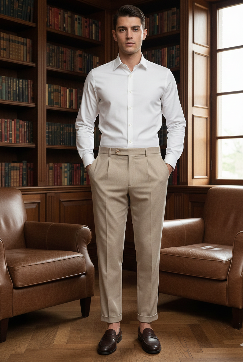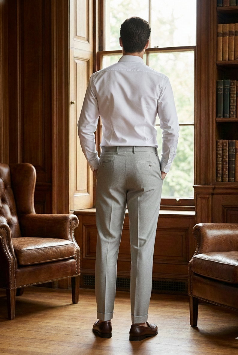 Crafted from a high-quality suiting blend, the Remo offers classic elegance with a modern cut. The extended waistband tab and pleated front add dimension and drape, while cuffed hems ground the silhouette in old-world sharpness.