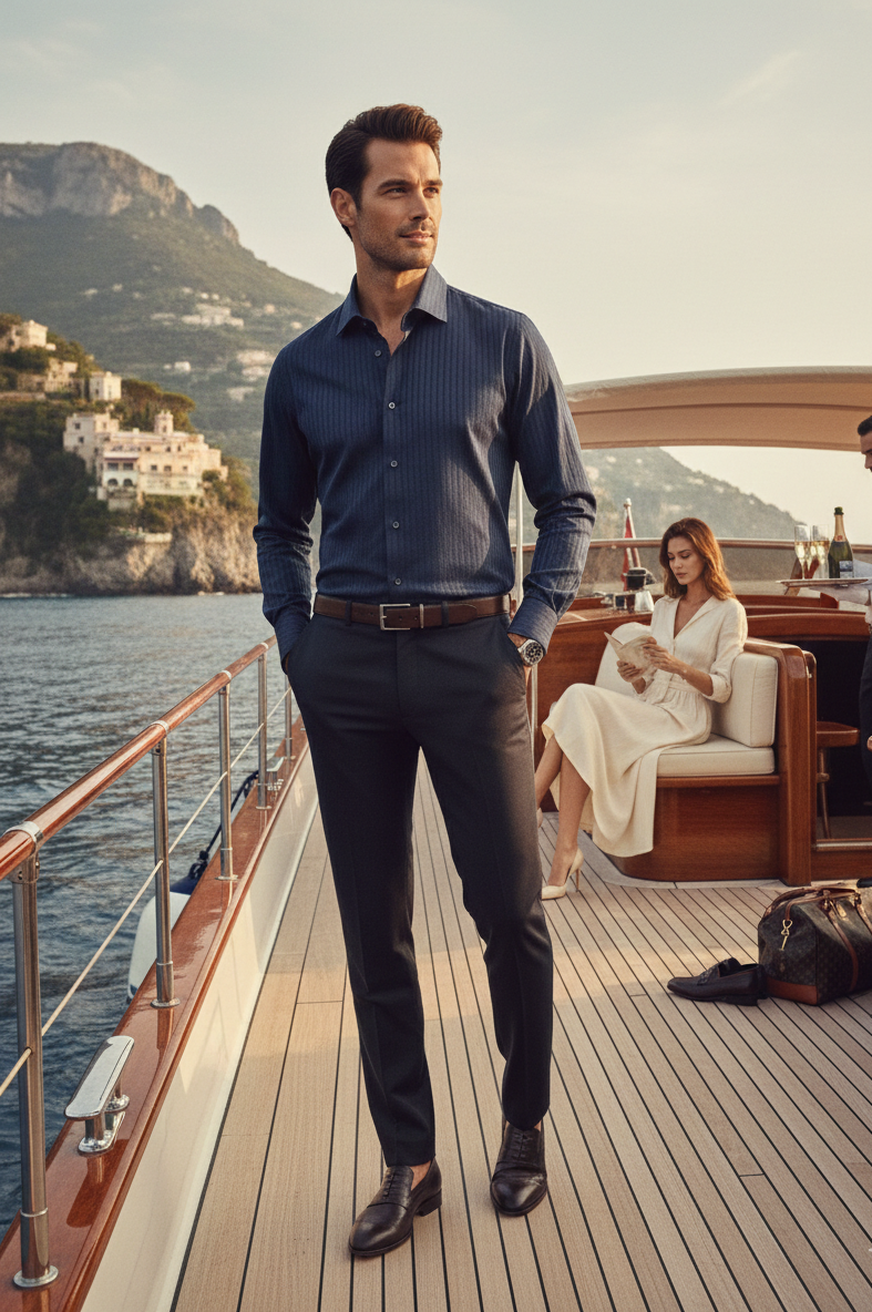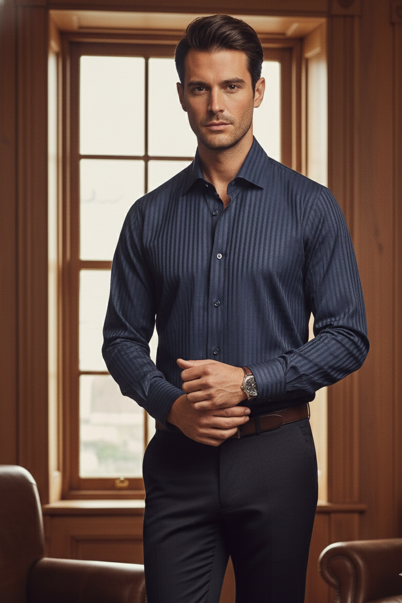 Wear the Shade Shirt under a tailored blazer for a sharp business look, or style it open-collar with dark trousers for relaxed evening refinement. Its deep navy tone makes it a versatile foundation piece.