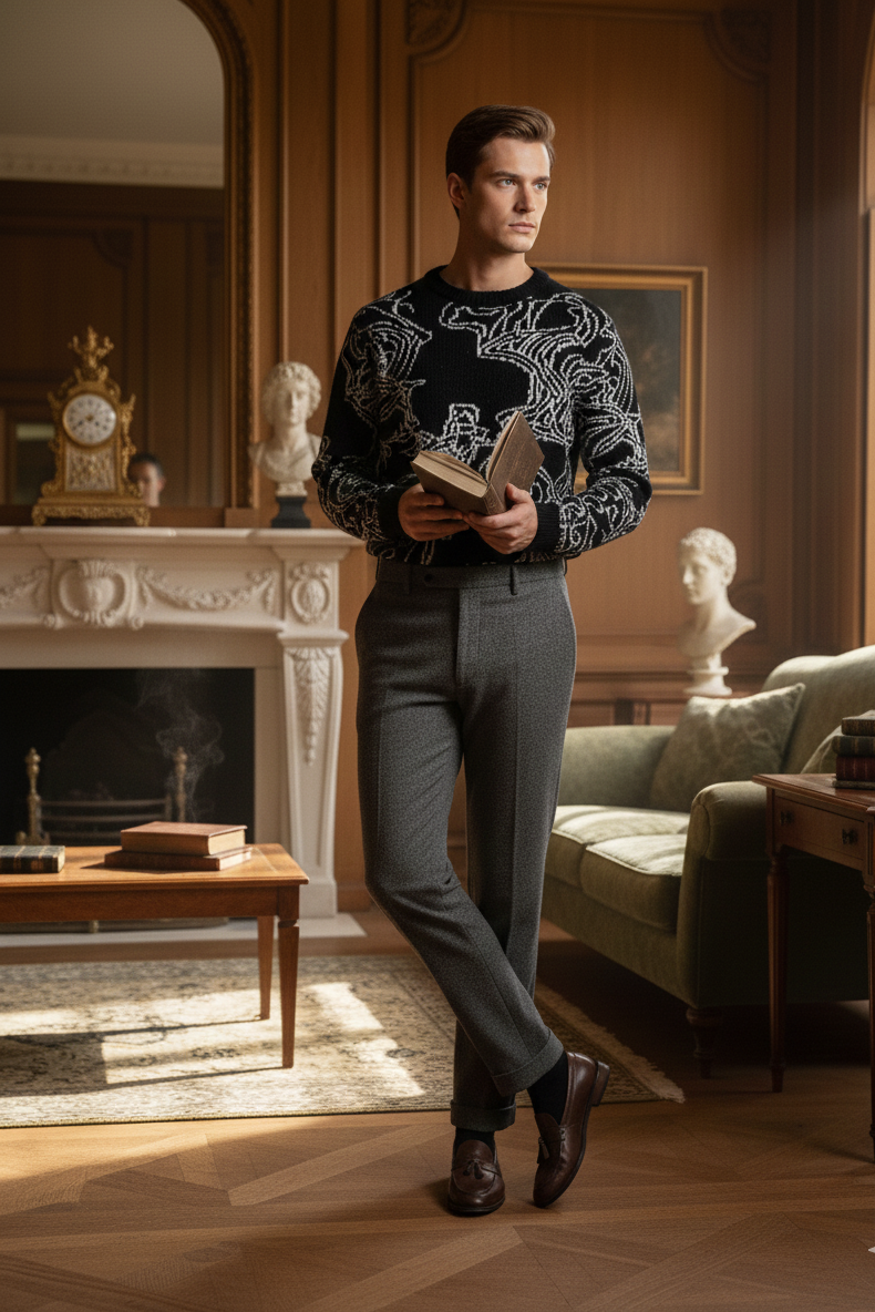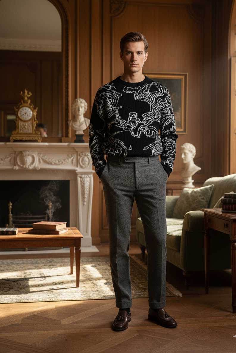 Statement knitwear with the soul of a canvas. The Swirl Sweater is unapologetically bold—abstract linework dances across the surface in monochrome contrast, creating a wearable piece of art that commands attention without saying a word.
