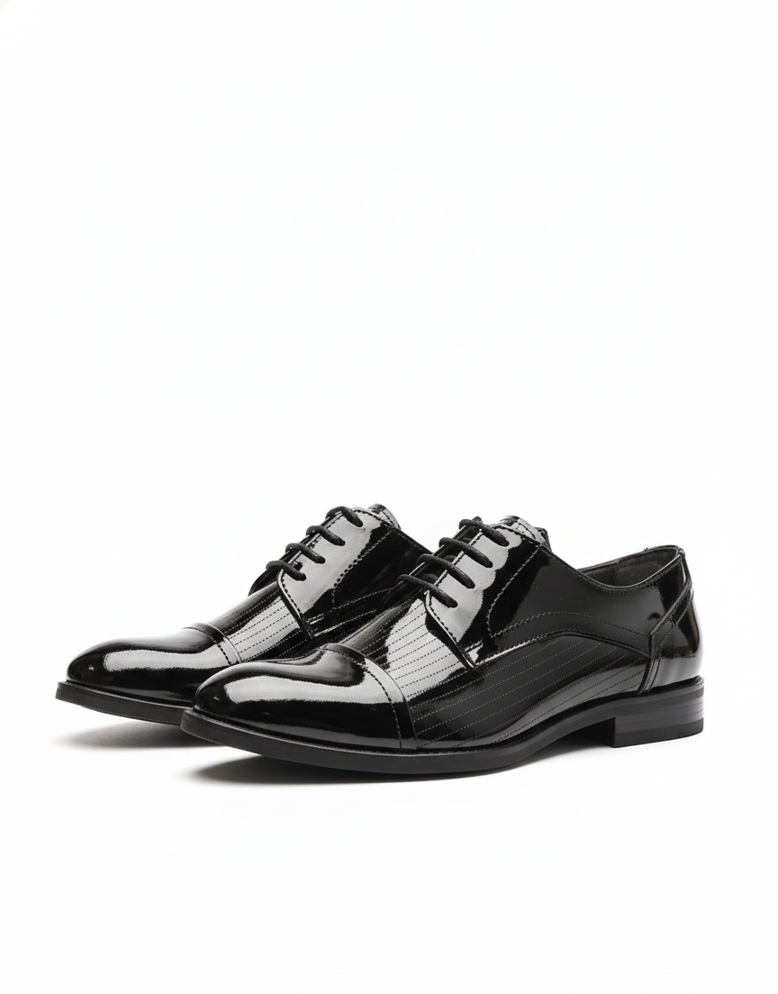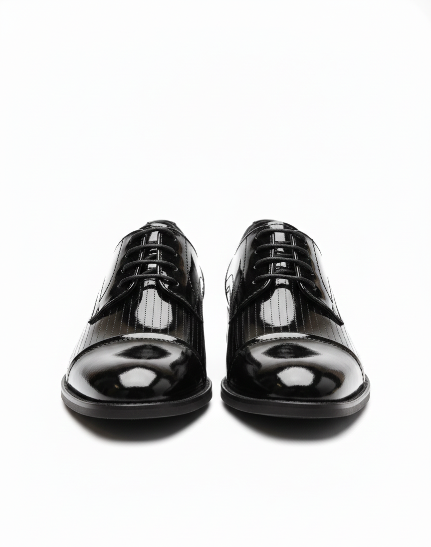The standout feature of this Oxford is its unique pinstriped leather pattern, a subtle nod to the classic tailoring of fine menswear. The stripes are intricately embossed into the premium full-grain calfskin leather, offering a refined texture of a slick-looking black patent sheen, that sets this shoe apart from traditional Oxfords. The sleek cap-toe design enhances its versatility, making it suitable for both boardroom meetings and black-tie events.